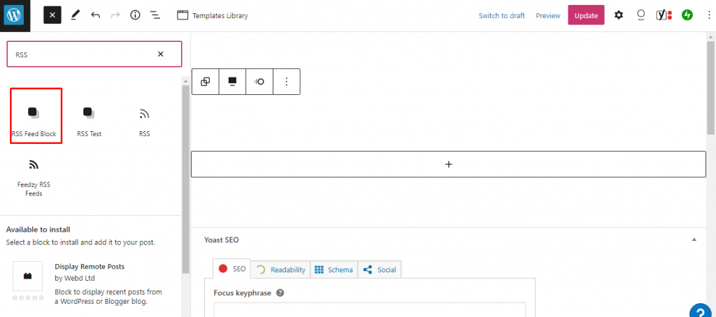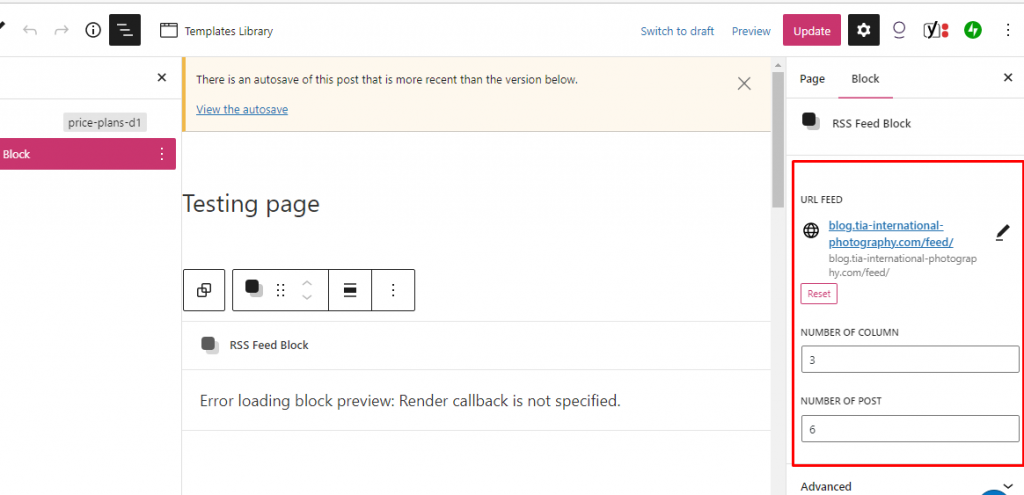 - Create a new page and find the block that you created. In this example, i named the block with “RSS Feed Block”