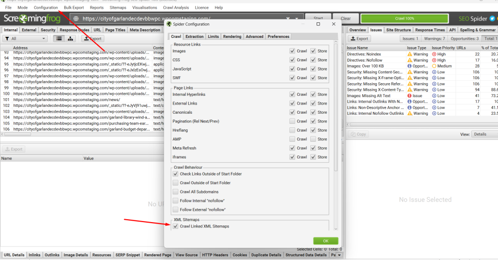 2. Open Screaming frog, Go to Configuration > Spider, and then check the “Crawl Linked XML Sitemaps (Showing on screenshot below).