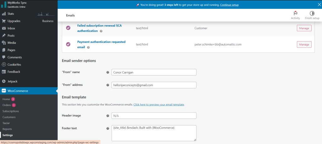 First, Need to setup email notifications from settings. On WordPress Dashboard, go to “Woocommerce > Settings > Emails ” and edit the email address shown on screenshot below.