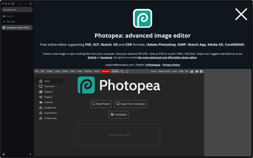 Photopea is an online alternative for Photoshop that can open PSD, XD, Sketch, XCF, and CDR files, and I primarily use this tool to optimize assets before uploading them to the website.