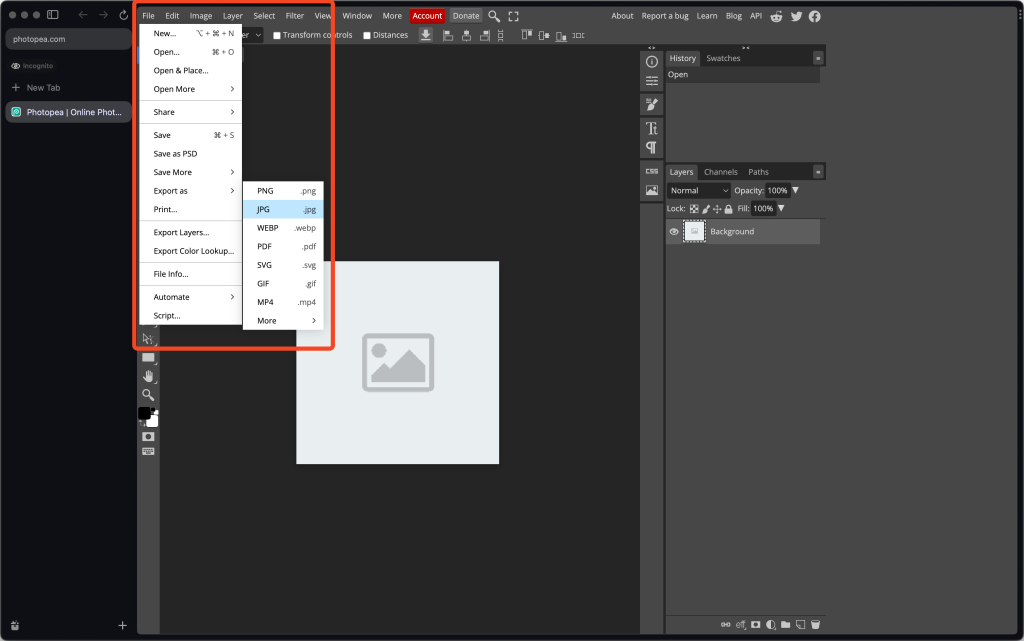 To edit and optimize an image, just drag and drop it onto the tool. To save an optimized copy of the image, click File > Export as then select the image format. For images with transparent elements, choose PNG and for images without any transparent elements, choose JPG.