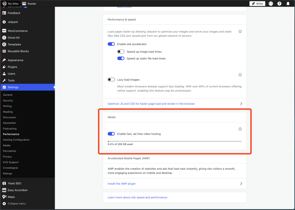 If a VideoPress block/video won’t show in your website, try disabling the “fast ad-free video hosting” provided by Jetpack/VideoPress, by going into Settings > Performance