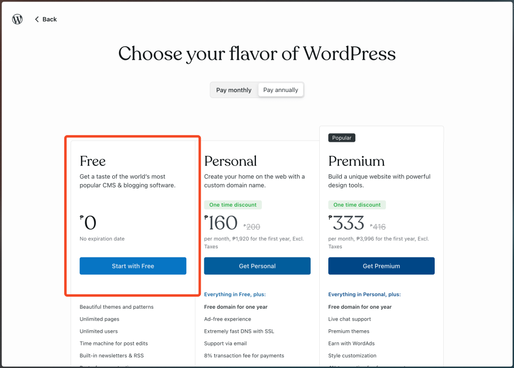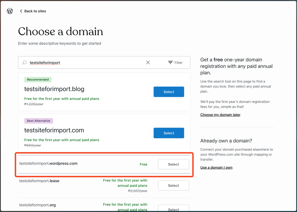 Next, choose a FREE domain. Select the FREE option.