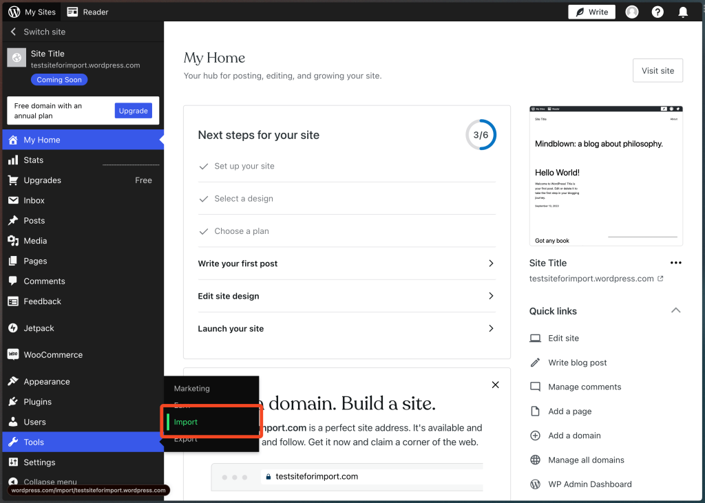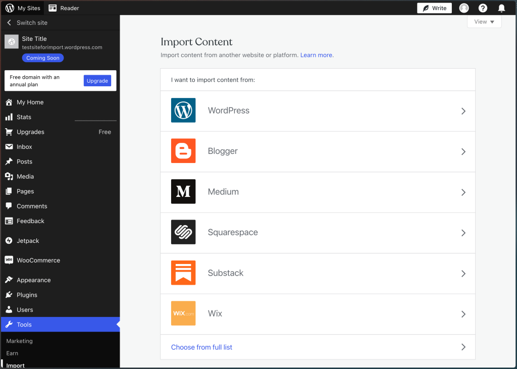 You can then import contents from Blogger, Wix, Medium, Squarespace, Substack, and from WordPress